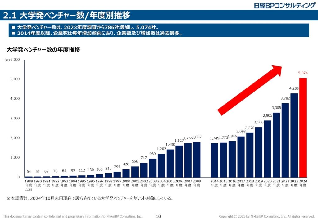 2025年3月に経済産業省が発表した「令和6年度技術開発調査等推進事業 大学発ベンチャーの実態などに関する調査(調査受託:日経BPコンサルティング)」によれば、2024年度の大学発ベンチャー数は、過去最多の5,074社に達しました。前年度からの増加数も786社と過去最多を記録し、2014年度以降、企業数は毎年増加傾向にあります。