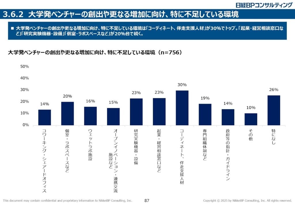 ここで再び、同調査のデータを見てみます。大学発ベンチャーの創出・増加に向けて「特に不足している環境」は何かという問いに対し、最も多くの企業(30%)が「コーディネート、伴走支援人材」と回答しました。