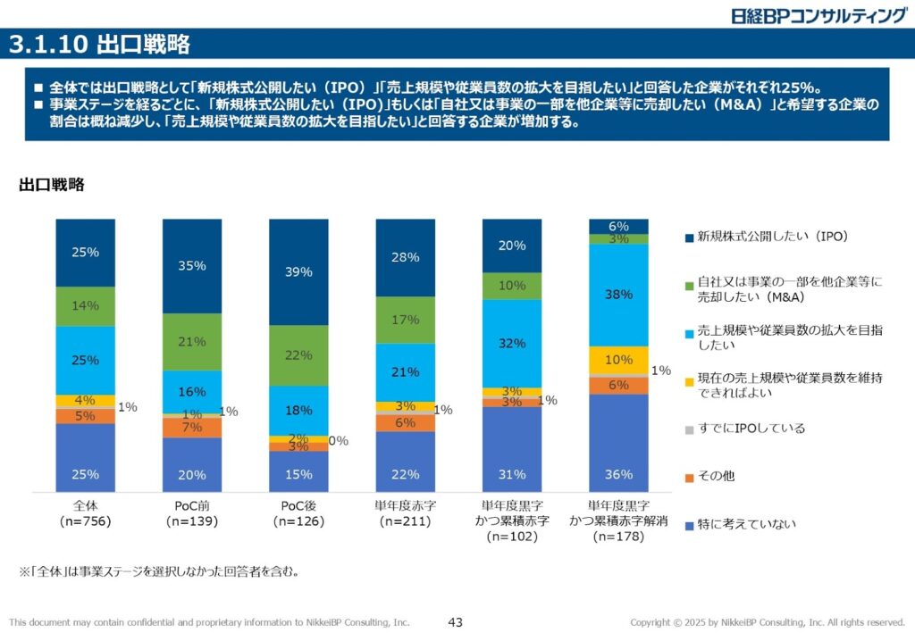 同調査で「出口戦略」については、「IPOしたい」が25%、「売上規模や従業員数の拡大を目指したい」も25%。その他、14%が「M&A」を目指し 、4%が「現在の売上規模や従業員数を維持できればよい」と回答。そして、25%は「特に考えていない」と答えています。