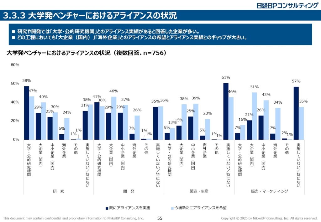 たとえば、大学発ベンチャーがアライアンスを組む相手は、「大学・公的研究機関」が58%(研究段階)と突出しています。一方で、「大企業(国内)」との連携を希望する声は40%あるものの、実績は29%に留まります。このギャップを埋め、企業との翻訳を担うのがコーディネーターです。