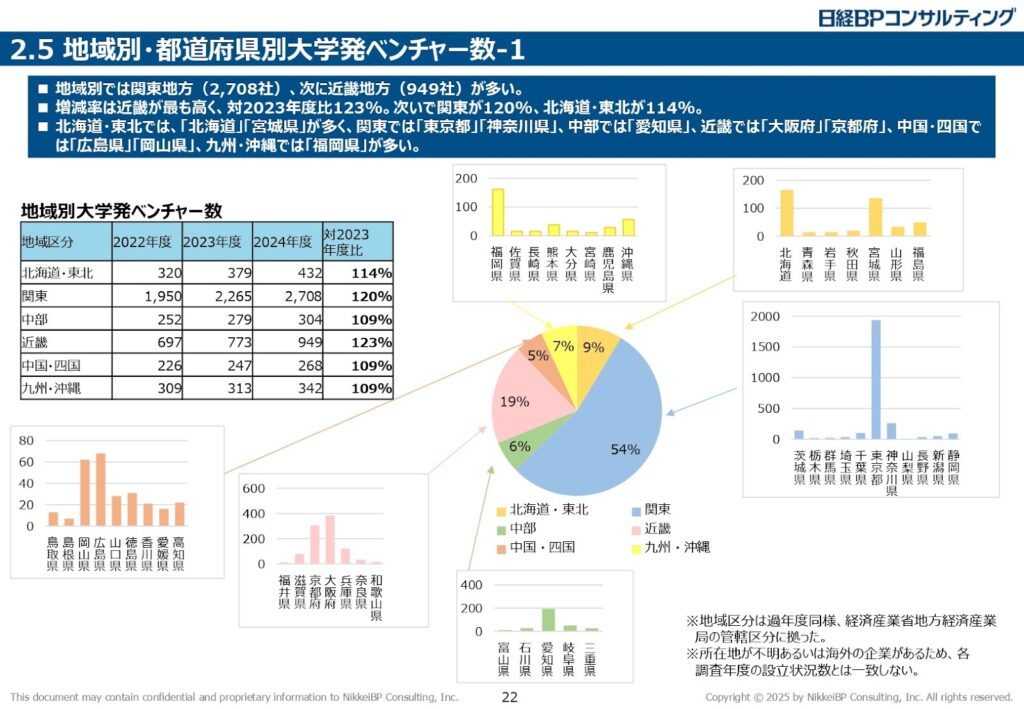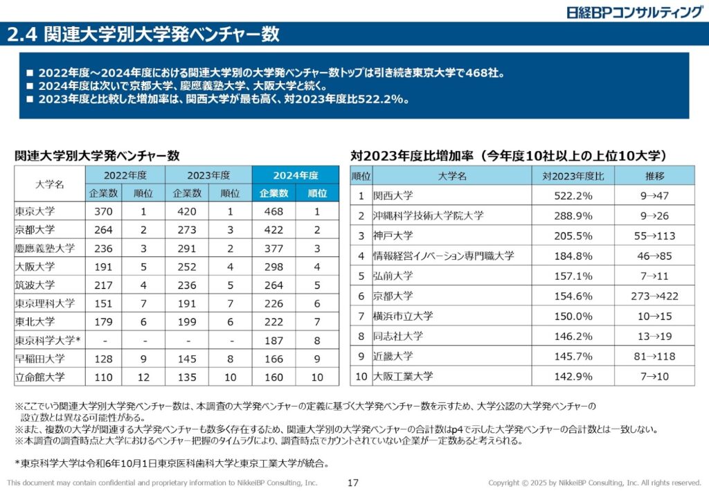 大学別の増加率に目を向けると、関西大学が対2023年度比522.2%という驚異的な伸びで1位になっているほか 、神戸大学(205.5%)、京都大学(154.6%)、近畿大学(145.7%)などもトップ10に入っており、関西圏が大学発ベンチャー創出のホットスポットであるかがわかります。