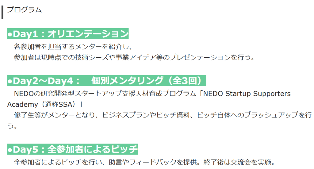 全5回の構成は、Day1で初回ピッチを行い、Day2~4で個別メンタリングを重ね、Day5で最終ピッチを行うというもの。