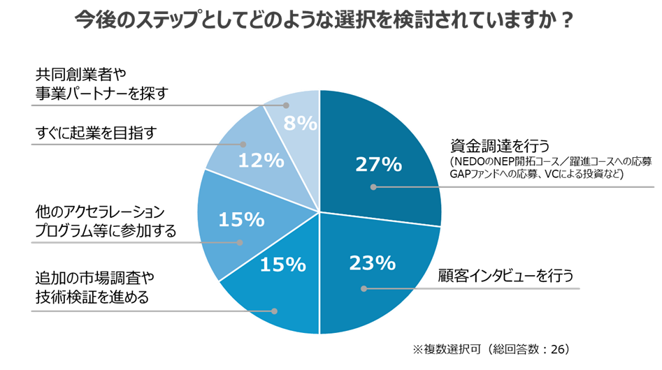 また、今後のステップとして参加者の多くが、「資金調達を行う(27%)」「顧客インタビューを行う(23%)」ことを検討しているのが分かりました。