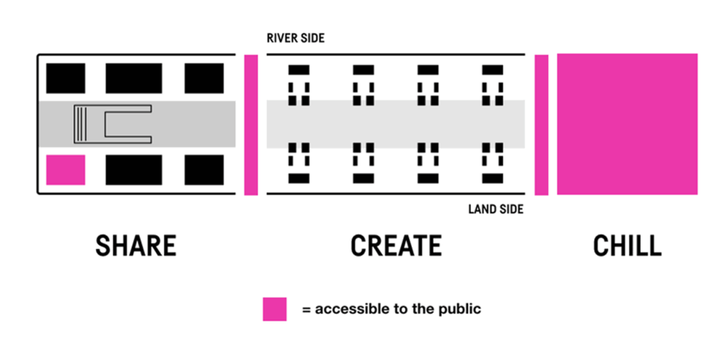 以下STATION Fの簡易的な俯瞰図からも分かるように、3つのゾーンに分かれています。