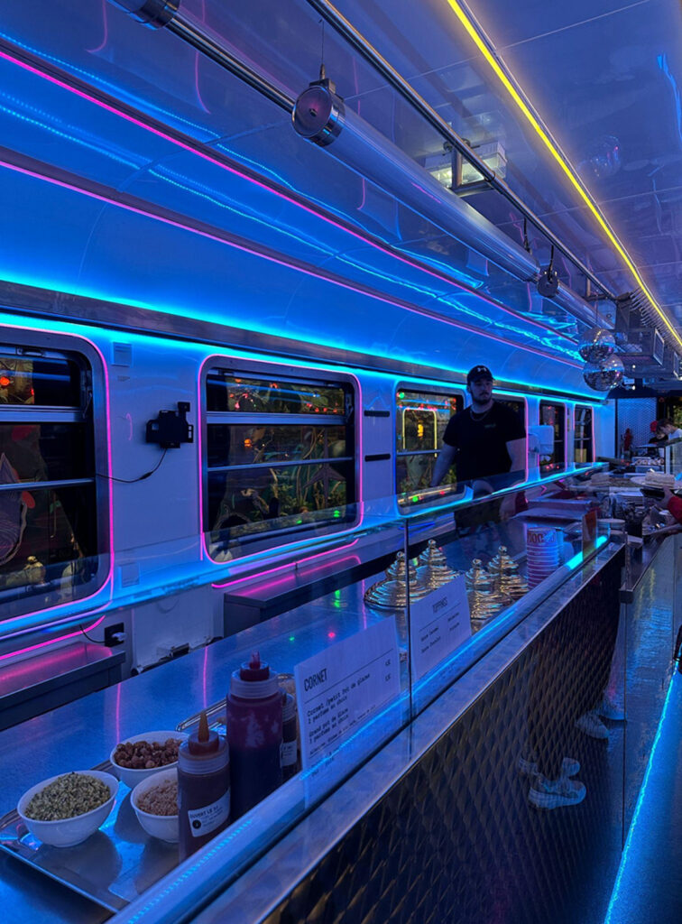 Zone CHILLの広いスペースにはSTATION Fにちなんで、実際の列車車両もレストランとして活用されています