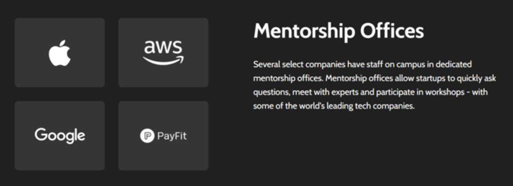 Mentorship Officesは、メンターシップのパートナーシップを組んだ企業がSTATION F内に設置するオフィスです。STATION Fに居住しているスタートアップは、そのオフィスに常駐するスタッフと交流が図れたり、その企業が提供するワークショップに参加できます。