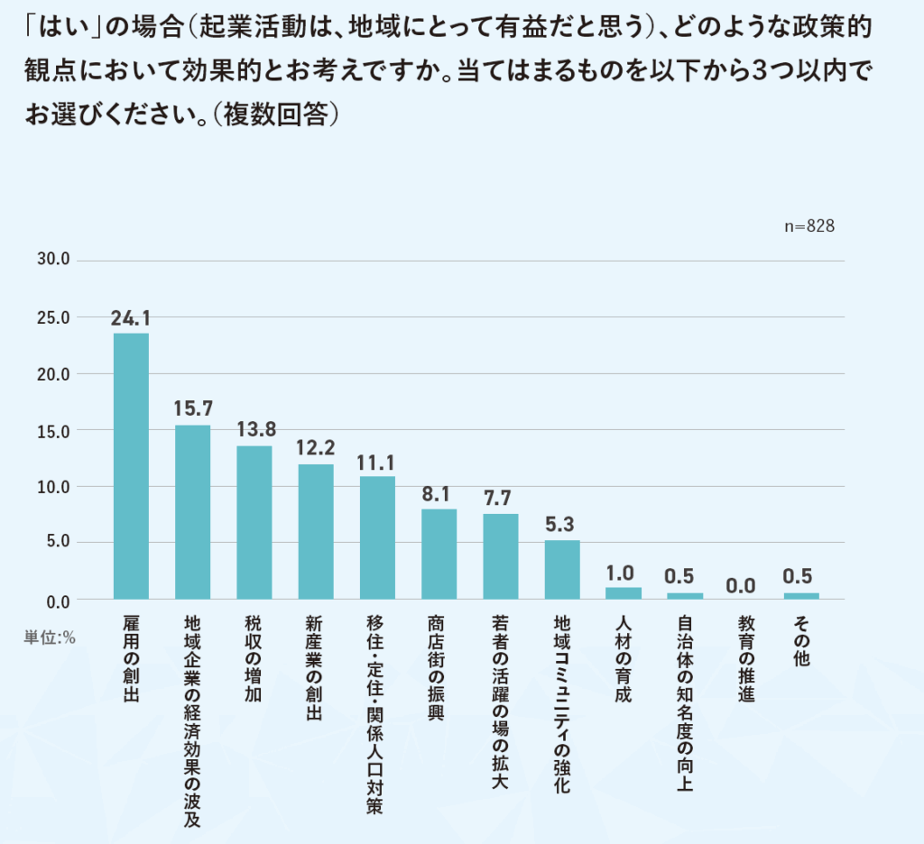 その他の多くの調査でも、自治体が創業支援を行う理由として「雇用の創出」等が上位に挙げられることが多い傾向にあります。これには、地域内で新たな雇用機会を生み出して税収につなげ、住民の生活向上につなげたいという期待が考えられます。
