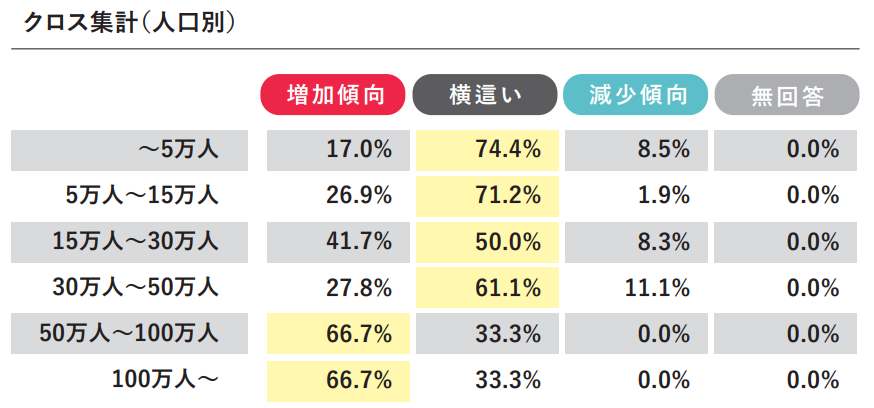 図8 起業支援白書 問6-1 クロス集計(人口別)「起業支援に係る予算増の変動