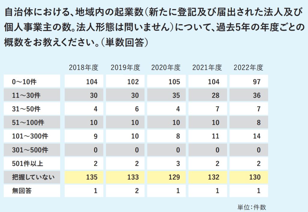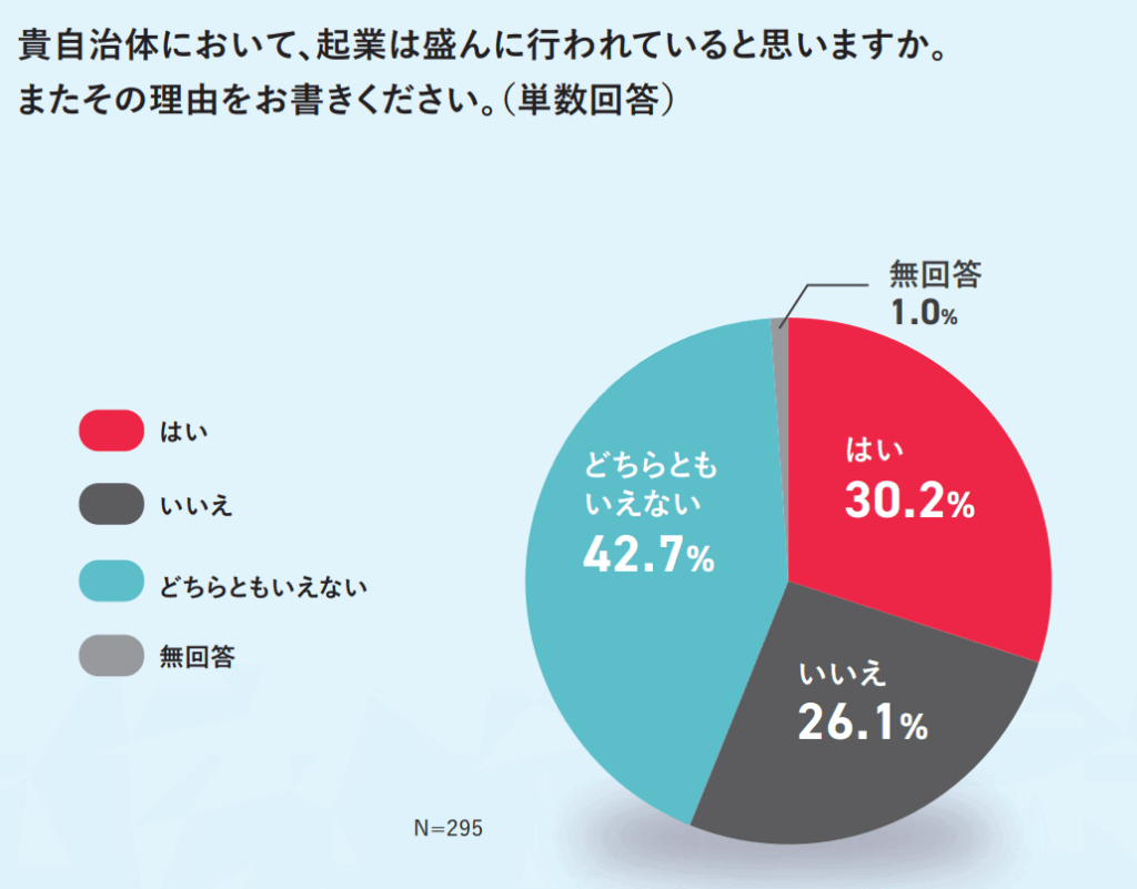 起業支援白書からは、創業支援を効果的に行う上でもう一つの課題として、多くの自治体が地域内の起業数を正確に把握できていない点も見えてきます。調査では、30.2%の自治体が自地域で起業が盛んに行われていると認識している一方、42.7%の自治体が「どちらともいえない」と回答しています(図9)。