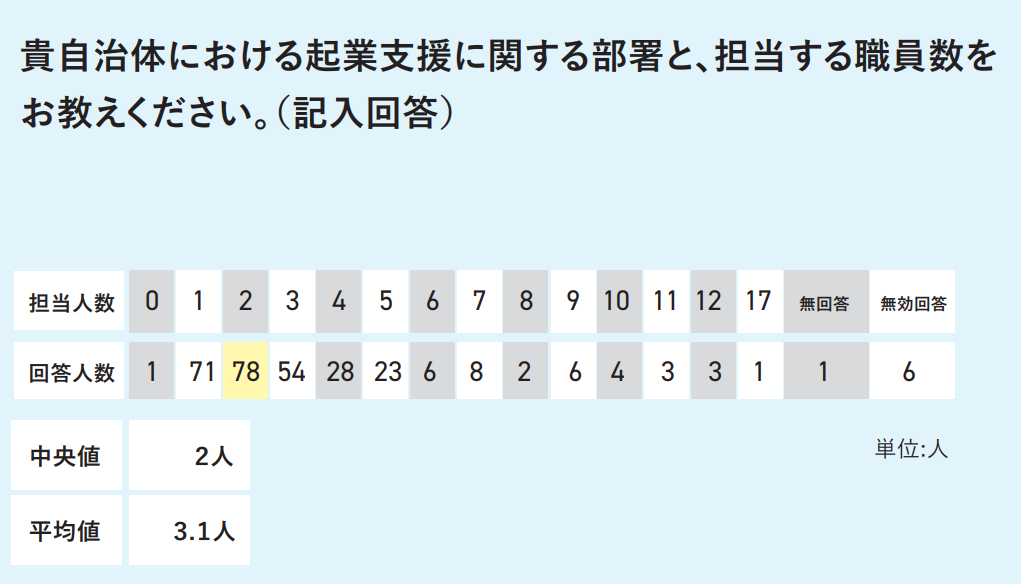 背景には、起業に関する統計データの収集が難しい現実があります。個人事業主の開業や、小規模な法人設立などは、自治体が即時に把握することが困難な場合が多いことに加え、データを把握するためには職員が能動的に動いて実態把握をしていかなければならない実情もあります。一方で、担当者の人数は限られており、多くの自治体が少人数で多数の事業を担当している状況です(図11)。それゆえ、起業後の事業継続状況や雇用創出の実態を追跡調査することまで手が回らないのではないでしょうか。